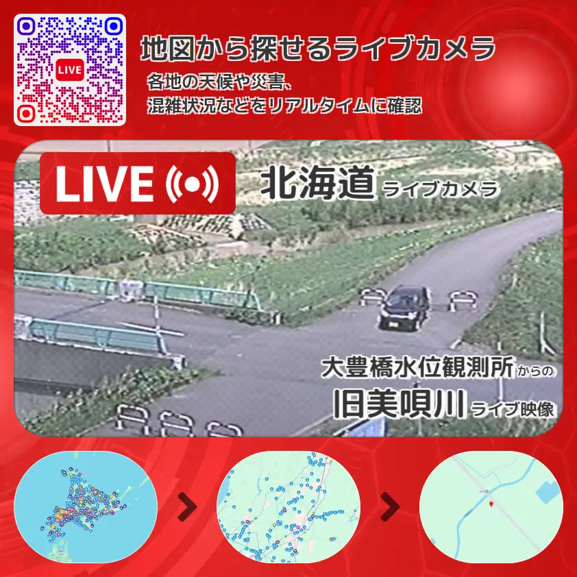旧美唄川の他に、大豊橋や周辺の気象状況も併せてチェックすることが可能で、台風・大雨・地震などの災害による被害状況も把握することができます。