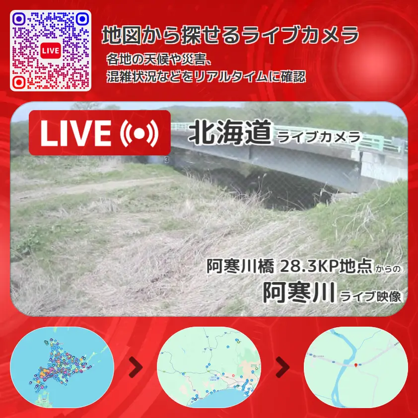 阿寒川の他に、阿寒川橋や周辺の気象状況も併せてチェックすることが可能で、台風・大雨・地震などの災害による被害状況も把握することができます。