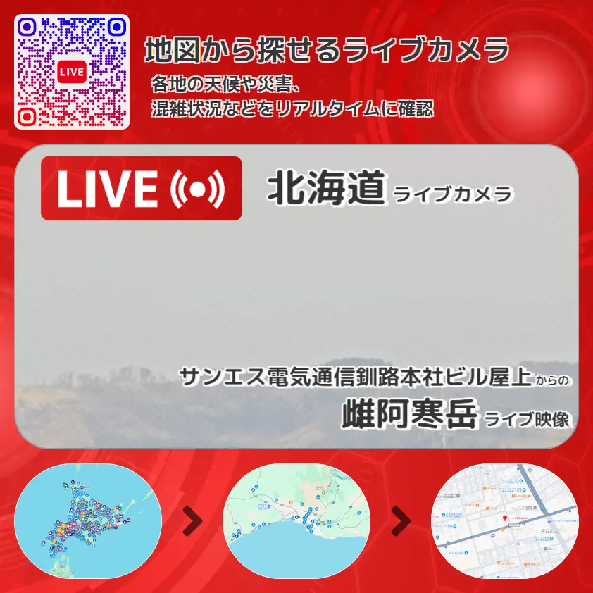 雌阿寒岳の他に、釧路中心市街地や周辺の気象状況も併せてチェックすることが可能で、台風・大雨・地震などの災害による被害状況も把握することができます。