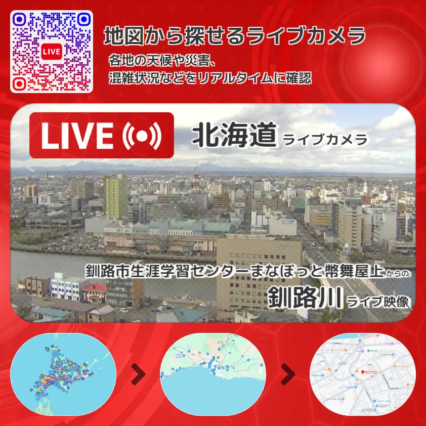 釧路川の他に、幣舞橋や周辺の気象状況も併せてチェックすることが可能で、台風・大雨・地震などの災害による被害状況も把握することができます。