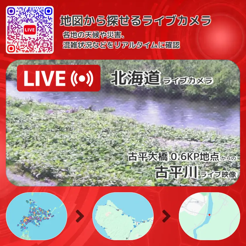 古平川の他に、古平大橋や周辺の気象状況も併せてチェックすることが可能で、台風・大雨・地震などの災害による被害状況も把握することができます。