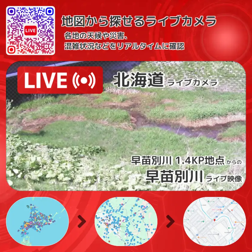 早苗別川の他に、南大通橋や周辺の気象状況も併せてチェックすることが可能で、台風・大雨・地震などの災害による被害状況も把握することができます。