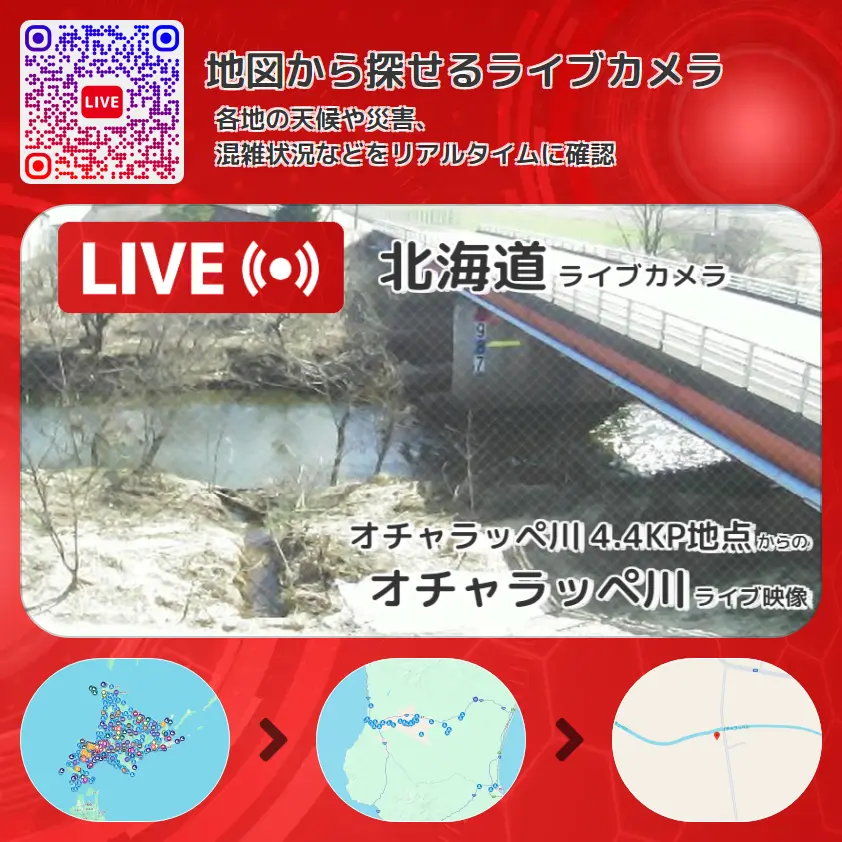オチャラッペ川の他に、八束橋や周辺の気象状況も併せてチェックすることが可能で、台風・大雨・地震などの災害による被害状況も把握することができます。