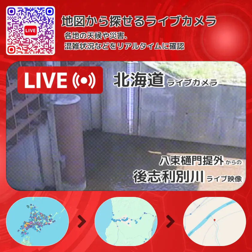 周辺の気象状況も併せてチェックすることが可能で、台風・大雨・地震などの災害による被害状況も把握することができます。