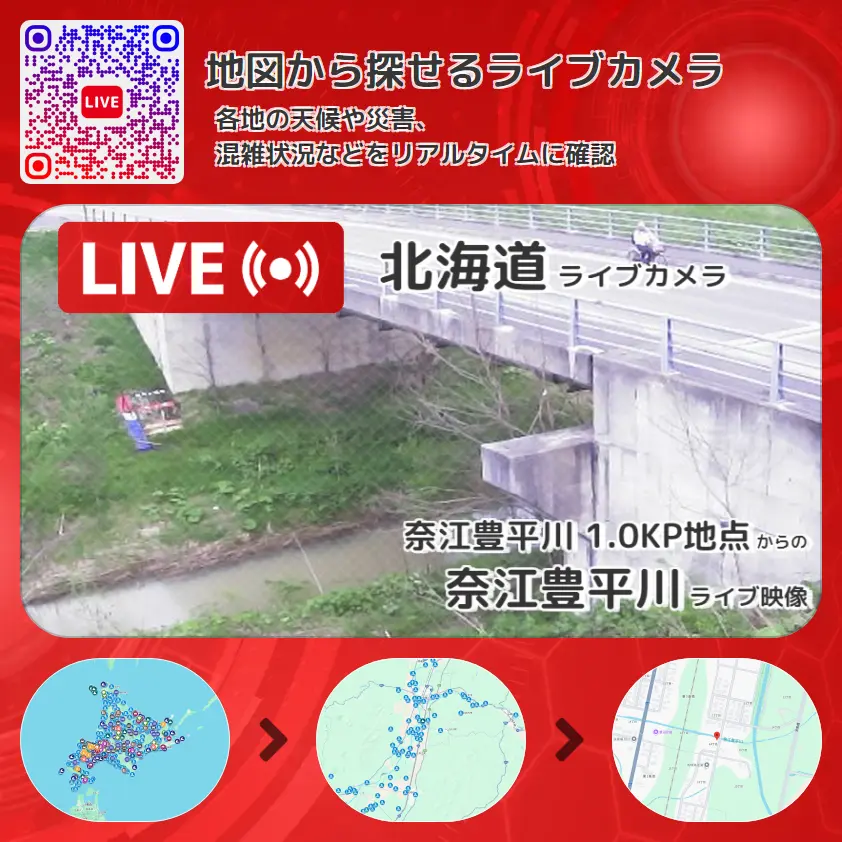 奈江豊平川の他に、日の出橋や周辺の気象状況も併せてチェックすることが可能で、台風・大雨・地震などの災害による被害状況も把握することができます。
