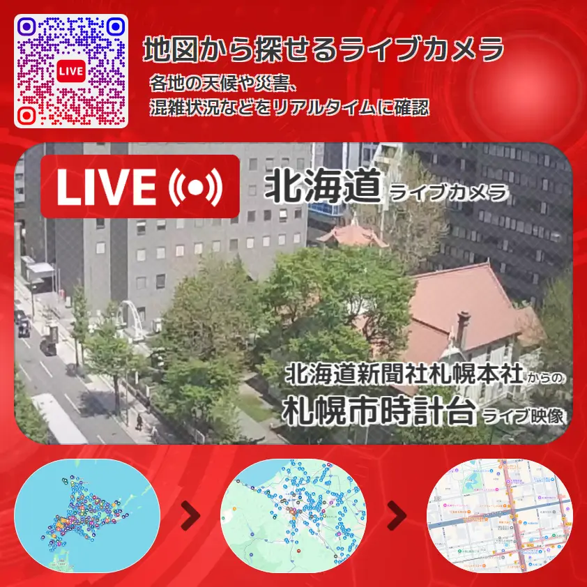 札幌市時計台(旧札幌農学校演武場)の他に、国道12号(北1条雁来通)や周辺の気象状況も併せてチェックすることが可能で、台風・大雨・地震などの災害による被害状況も把握することができます。