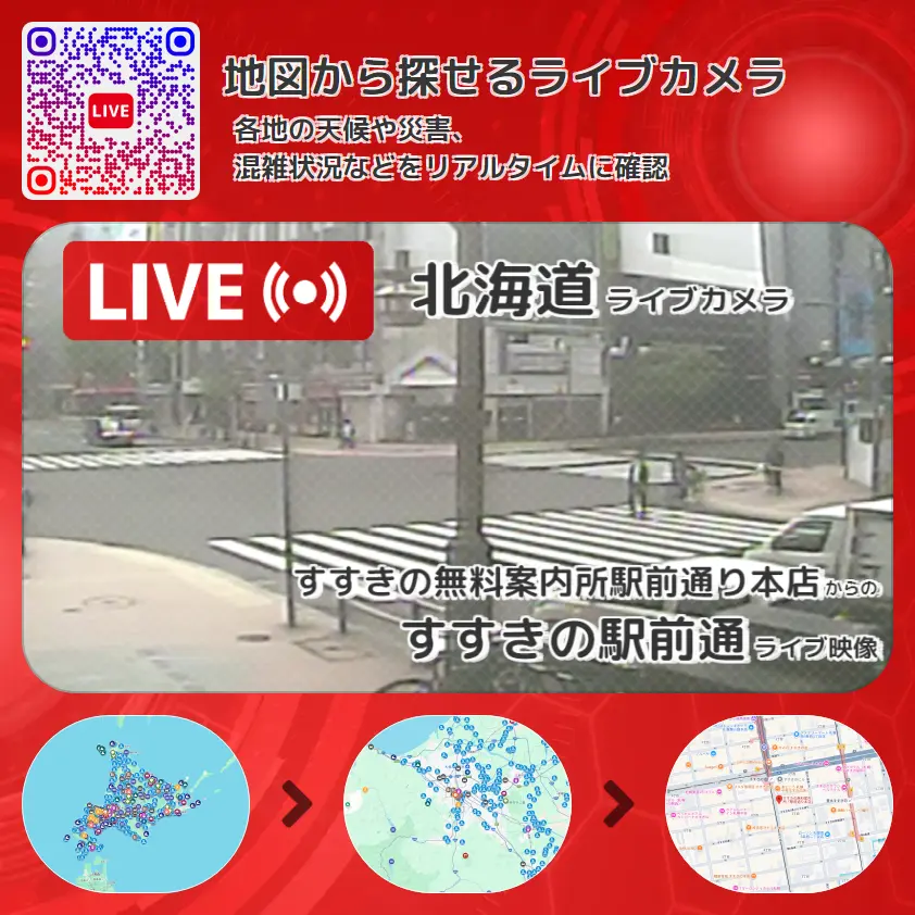すすきの駅前通(札幌駅前通)の他に、ススキノ周辺や周辺の気象状況も併せてチェックすることが可能で、台風・大雨・地震などの災害による被害状況も把握することができます。