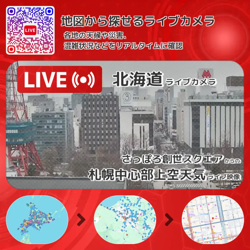 札幌中心部上空天気の他に、大通公園や周辺の気象状況も併せてチェックすることが可能で、台風・大雨・地震などの災害による被害状況も把握することができます。