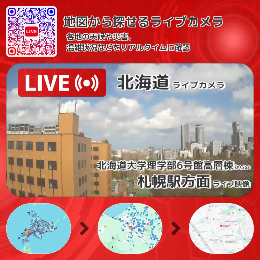 札幌駅方面の他に、北海道大学キャンパス内や周辺の気象状況も併せてチェックすることが可能で、台風・大雨・地震などの災害による被害状況も把握することができます。
