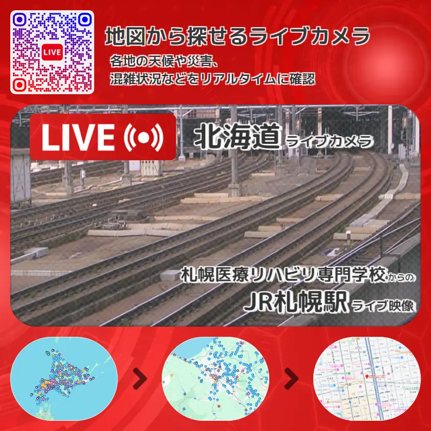 JR札幌駅(ホーム・線路)の他に、JR函館本線や周辺の気象状況も併せてチェックすることが可能で、台風・大雨・地震などの災害による被害状況も把握することができます。