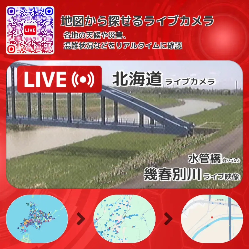 幾春別川の他に、萱野水管橋や周辺の気象状況も併せてチェックすることが可能で、台風・大雨・地震などの災害による被害状況も把握することができます。