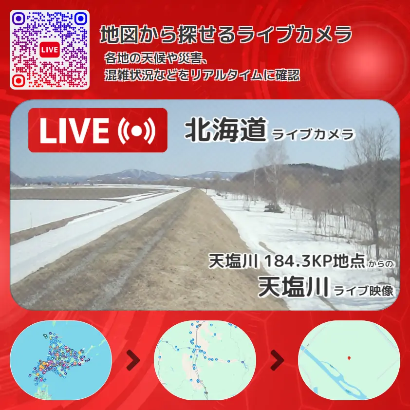 周辺の気象状況も併せてチェックすることが可能で、台風・大雨・地震などの災害による被害状況も把握することができます。