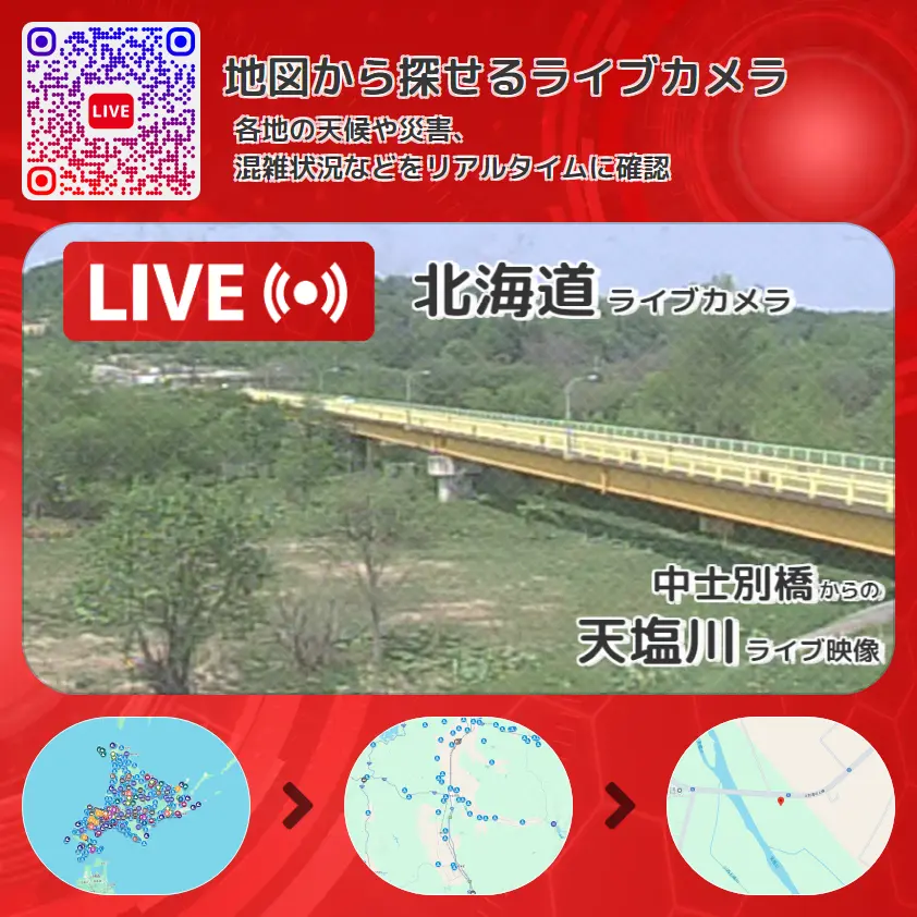 天塩川の他に、北海道道61号士別滝の上線や周辺の気象状況も併せてチェックすることが可能で、台風・大雨・地震などの災害による被害状況も把握することができます。