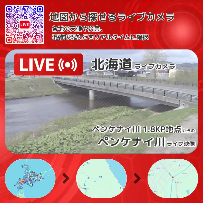 ペンケナイ川(辺毛内川)の他に、辺毛内橋(ペンケナイ橋)や周辺の気象状況も併せてチェックすることが可能で、台風・大雨・地震などの災害による被害状況も把握することができます。