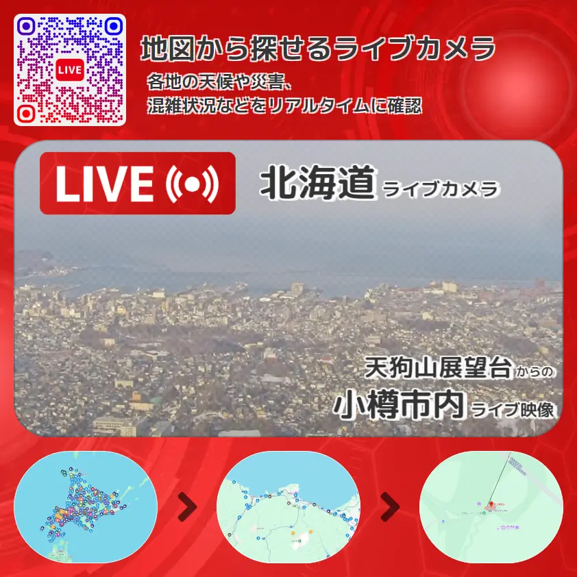 小樽市内の他に、小樽夜景(北海道三大夜景)や周辺の気象状況も併せてチェックすることが可能で、台風・大雨・地震などの災害による被害状況も把握することができます。