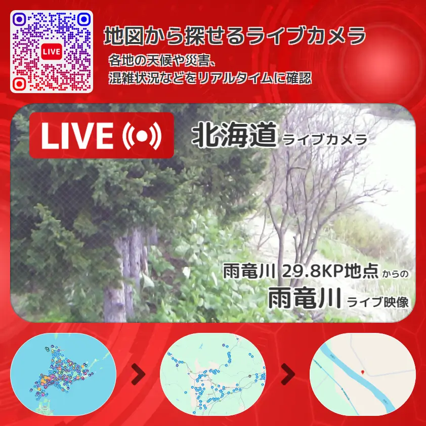 周辺の気象状況も併せてチェックすることが可能で、台風・大雨・地震などの災害による被害状況も把握することができます。