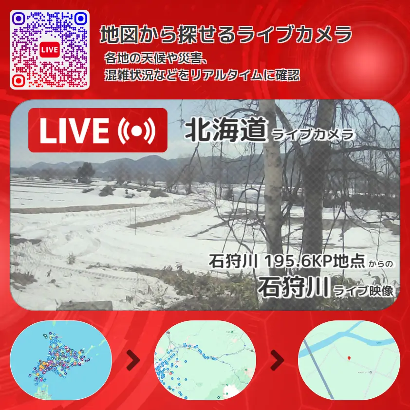 周辺の気象状況も併せてチェックすることが可能で、台風・大雨・地震などの災害による被害状況も把握することができます。