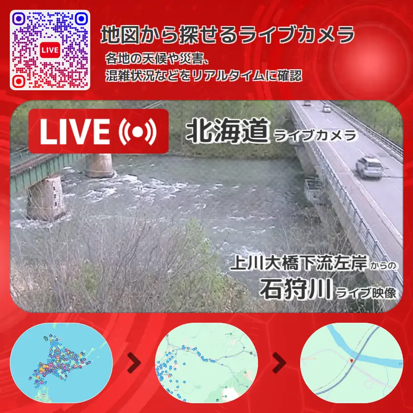 石狩川の他に、国道39号(大雪国道)や周辺の気象状況も併せてチェックすることが可能で、台風・大雨・地震などの災害による被害状況も把握することができます。