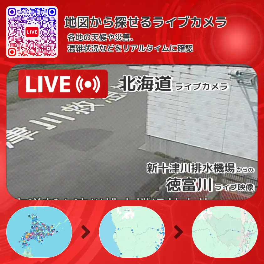 周辺の気象状況も併せてチェックすることが可能で、台風・大雨・地震などの災害による被害状況も把握することができます。