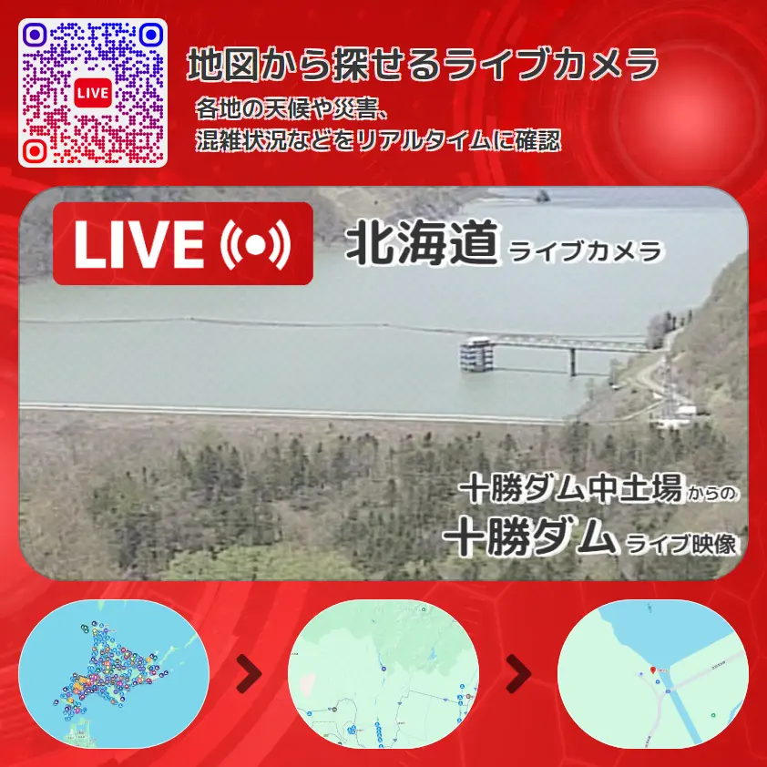 十勝ダムの他に、十勝川や周辺の気象状況も併せてチェックすることが可能で、台風・大雨・地震などの災害による被害状況も把握することができます。