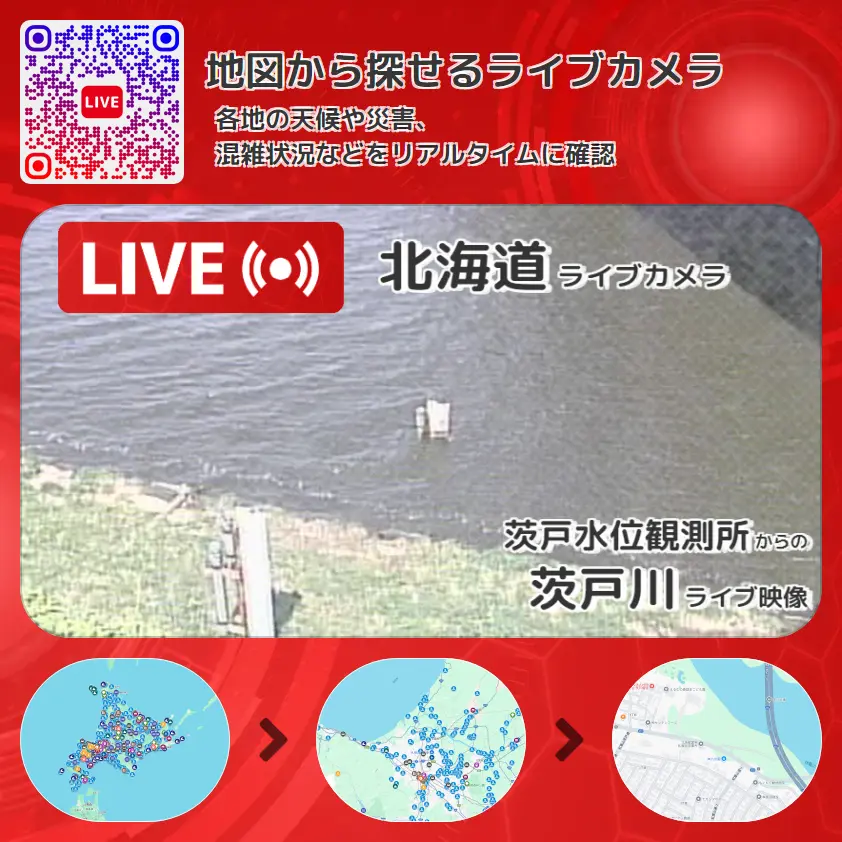 茨戸川の他に、国道231号(創成川通)付近や周辺の気象状況も併せてチェックすることが可能で、台風・大雨・地震などの災害による被害状況も把握することができます。