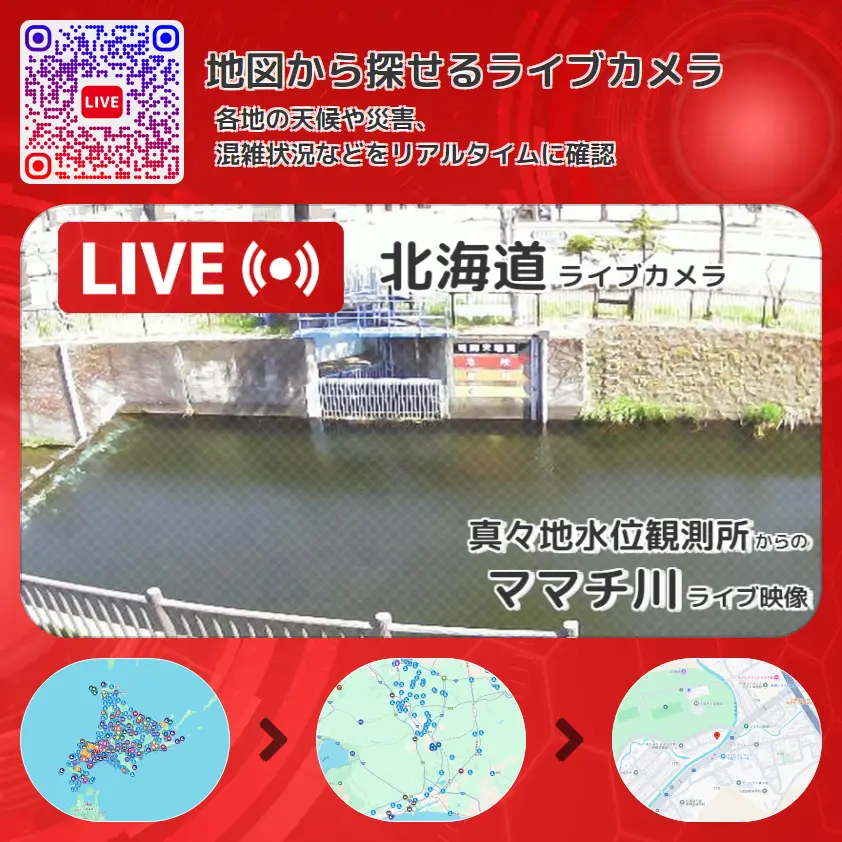 ママチ川(真々地川)の他に、北海道道77号千歳インター線や周辺の気象状況も併せてチェックすることが可能で、台風・大雨・地震などの災害による被害状況も把握することができます。