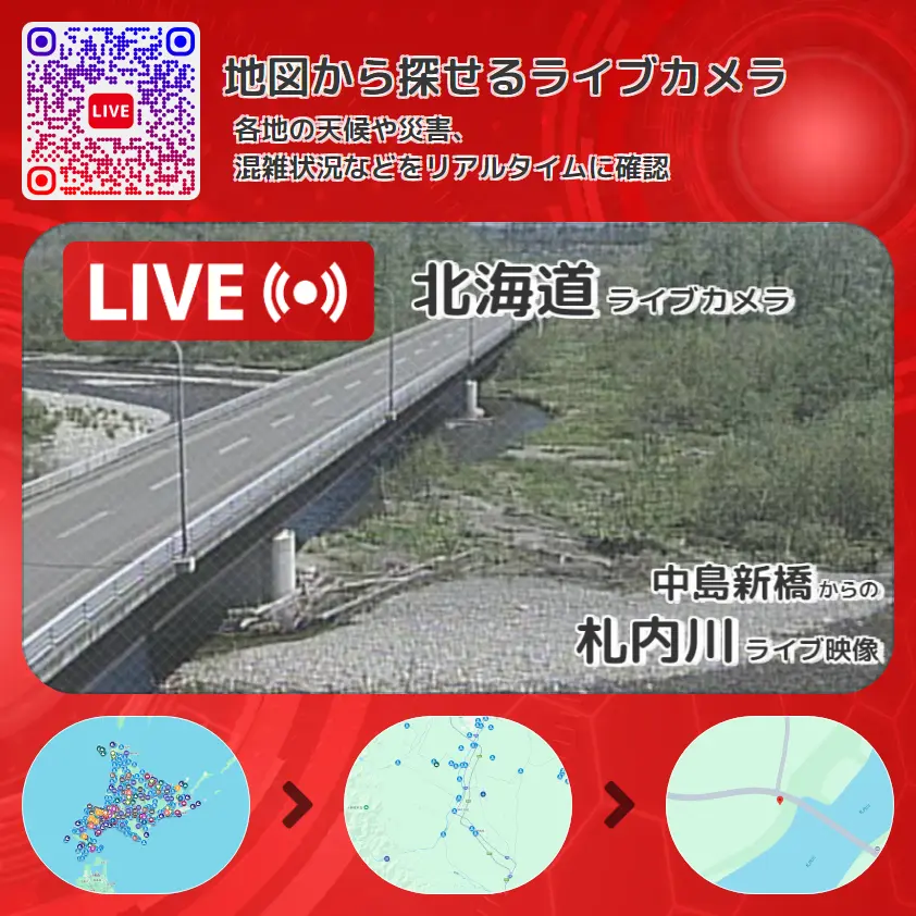 札内川の他に、中島新橋や周辺の気象状況も併せてチェックすることが可能で、台風・大雨・地震などの災害による被害状況も把握することができます。