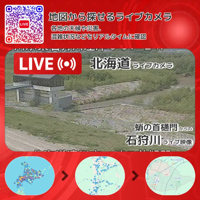 周辺の気象状況も併せてチェックすることが可能で、台風・大雨・地震などの災害による被害状況も把握することができます。