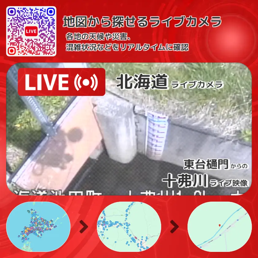 周辺の気象状況も併せてチェックすることが可能で、台風・大雨・地震などの災害による被害状況も把握することができます。