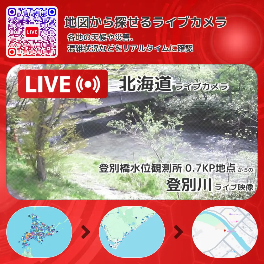 登別川の他に、登別橋や周辺の気象状況も併せてチェックすることが可能で、台風・大雨・地震などの災害による被害状況も把握することができます。