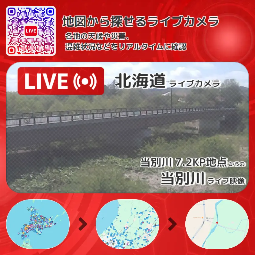 当別川の他に、学校橋や周辺の気象状況も併せてチェックすることが可能で、台風・大雨・地震などの災害による被害状況も把握することができます。