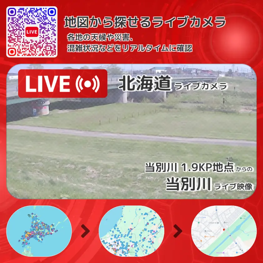 当別川の他に、当別新橋や周辺の気象状況も併せてチェックすることが可能で、台風・大雨・地震などの災害による被害状況も把握することができます。