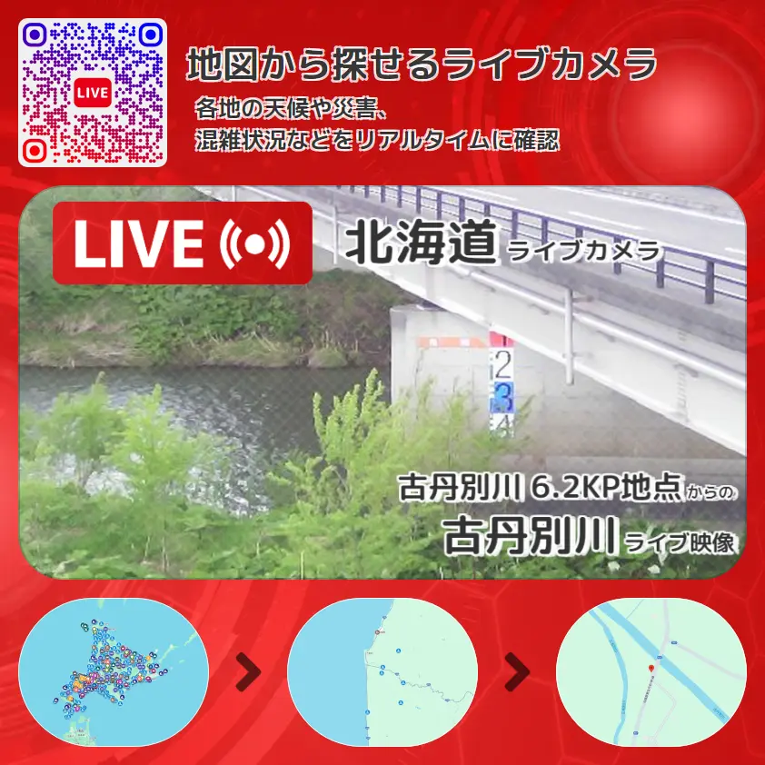 古丹別川の他に、二股橋や周辺の気象状況も併せてチェックすることが可能で、台風・大雨・地震などの災害による被害状況も把握することができます。