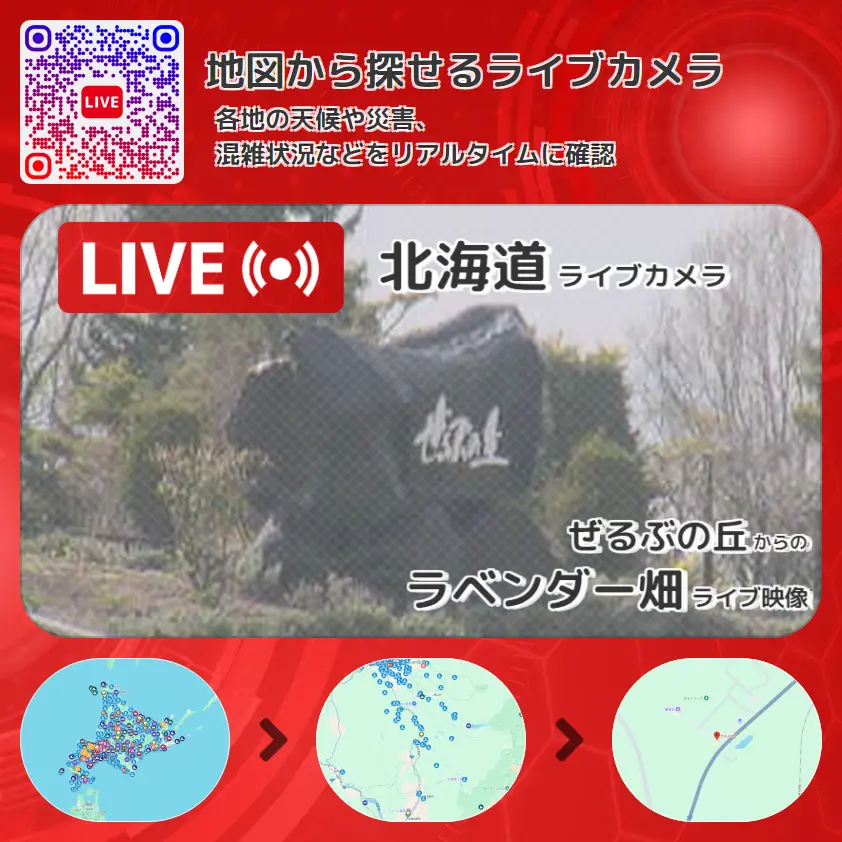 ラベンダー畑の他に、ひまわり畑や周辺の気象状況も併せてチェックすることが可能で、台風・大雨・地震などの災害による被害状況も把握することができます。