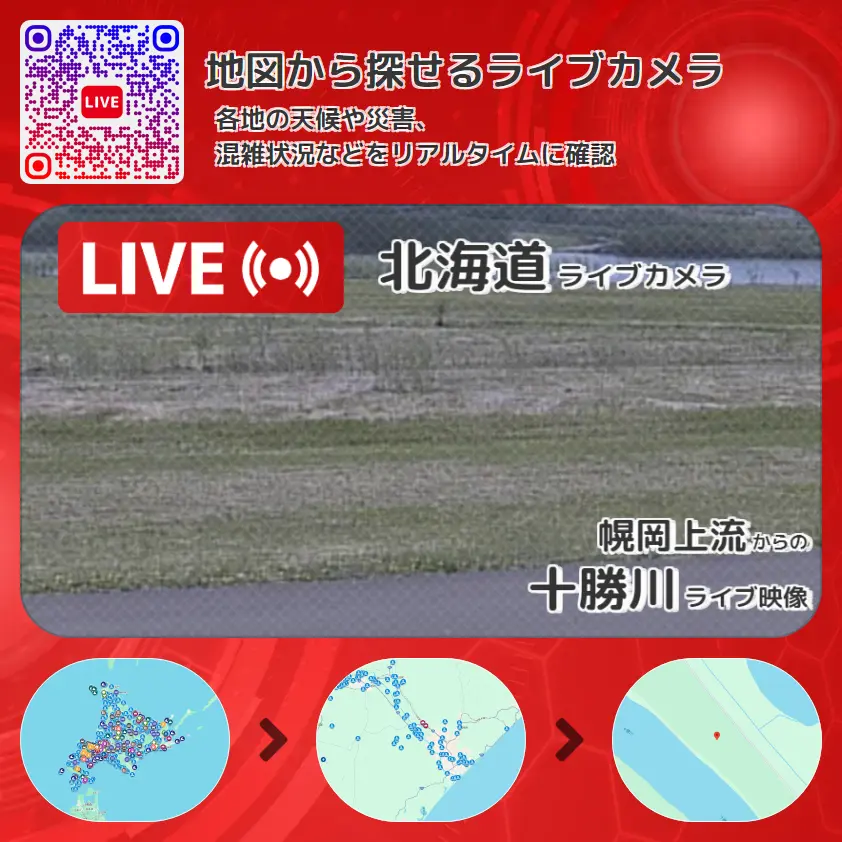 十勝川の他に、十勝川背負川合流地点付近や周辺の気象状況も併せてチェックすることが可能で、台風・大雨・地震などの災害による被害状況も把握することができます。