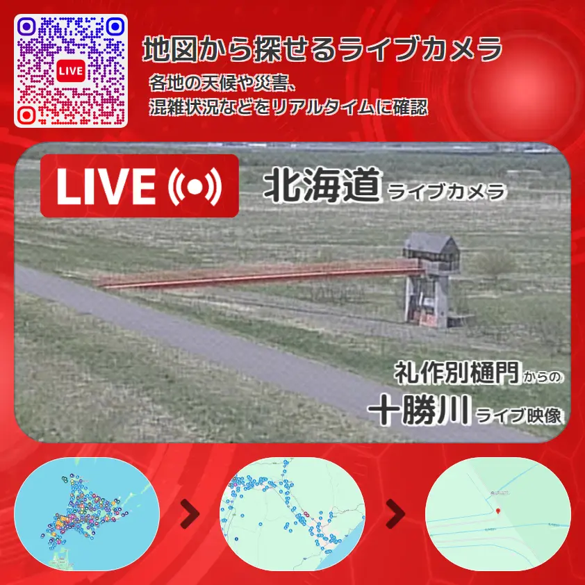 十勝川の他に、礼作別川付近や周辺の気象状況も併せてチェックすることが可能で、台風・大雨・地震などの災害による被害状況も把握することができます。