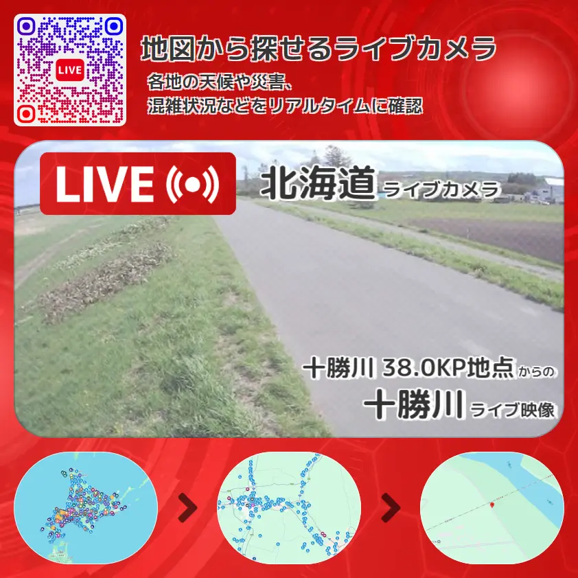十勝川の他に、十勝川猿別川合流地点付近や周辺の気象状況も併せてチェックすることが可能で、台風・大雨・地震などの災害による被害状況も把握することができます。