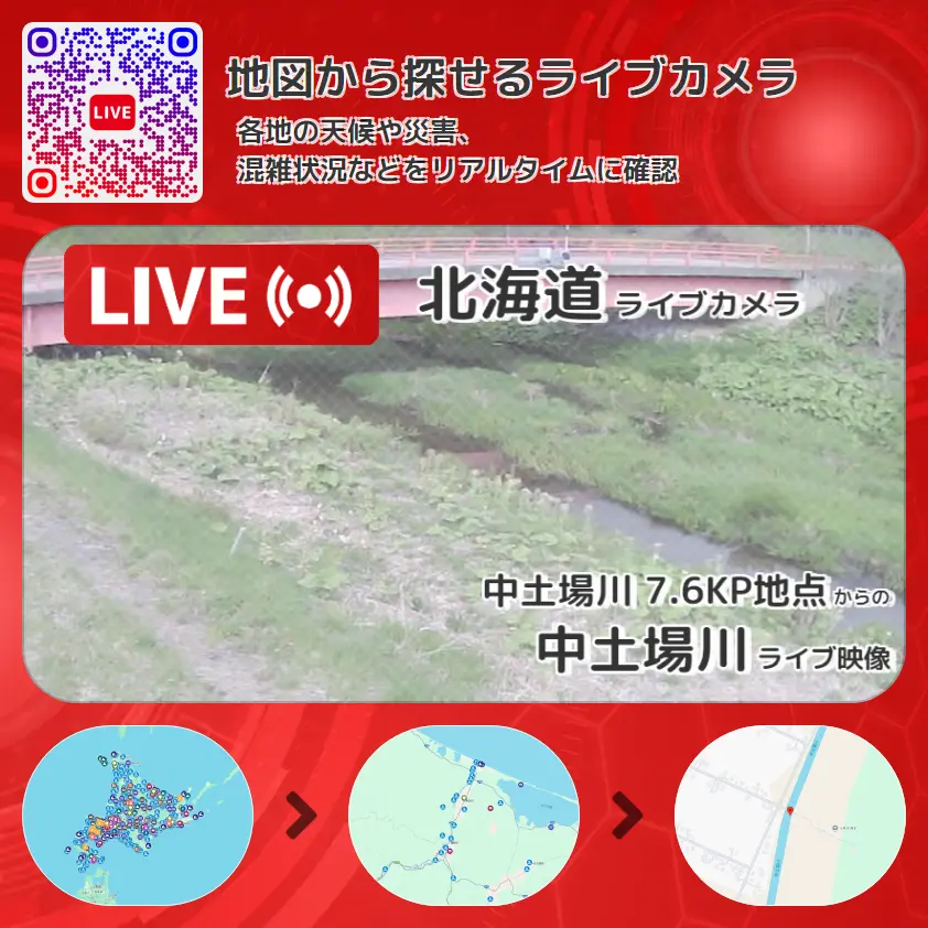 中土場川の他に、北見天満宮方面や周辺の気象状況も併せてチェックすることが可能で、台風・大雨・地震などの災害による被害状況も把握することができます。