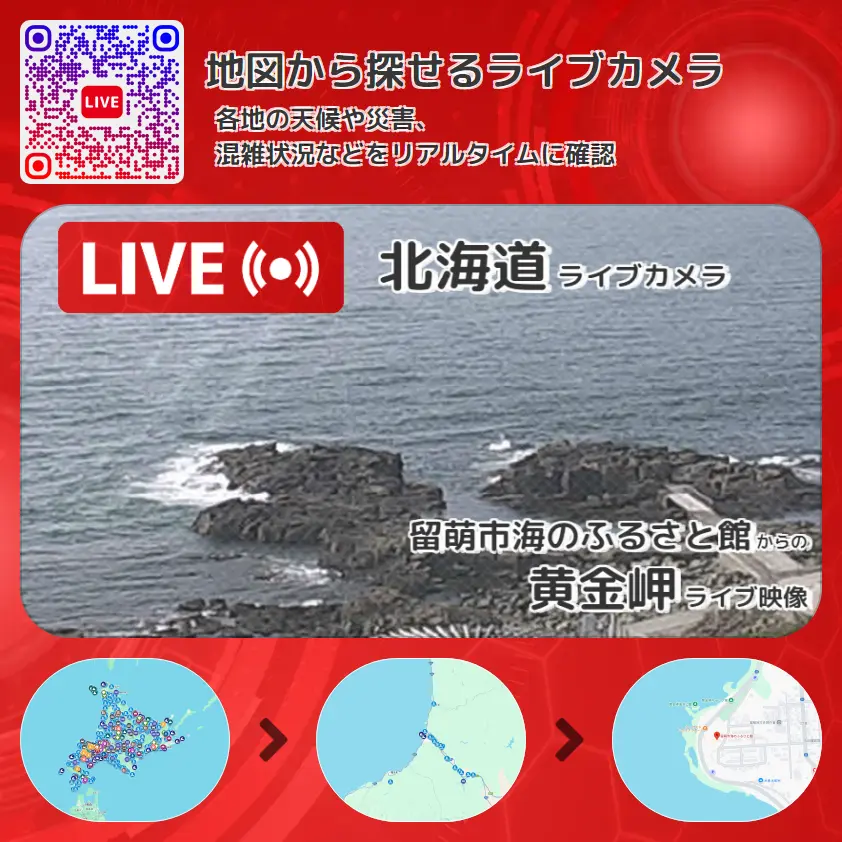 黄金岬の他に、黄金岬海浜公園や周辺の気象状況も併せてチェックすることが可能で、台風・大雨・地震などの災害による被害状況も把握することができます。