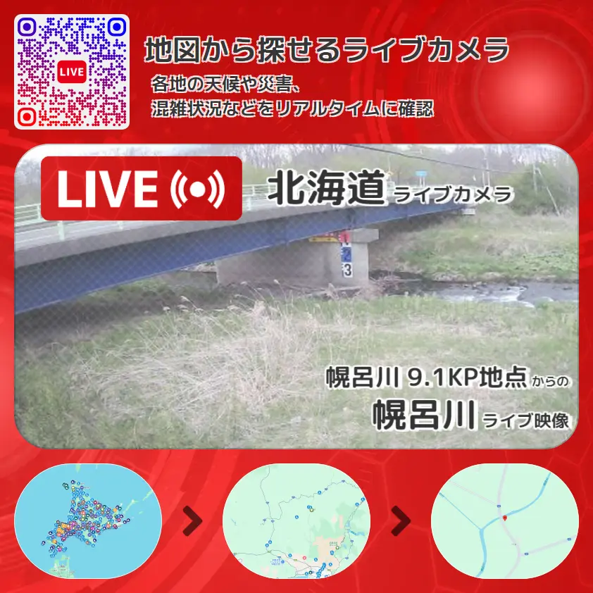 幌呂川の他に、幌呂川茂幌呂川(モホロロ川)合流地点付近や周辺の気象状況も併せてチェックすることが可能で、台風・大雨・地震などの災害による被害状況も把握することができます。