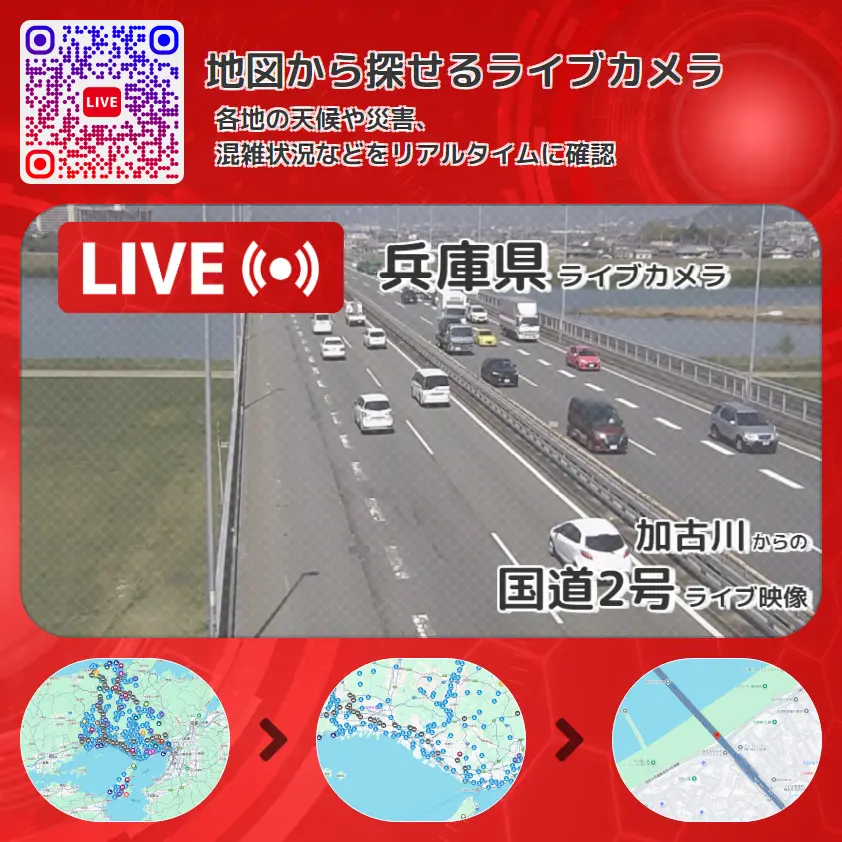 周辺の気象状況も併せてチェックすることが可能で、台風・大雨・地震などの災害による被害状況も把握することができます。