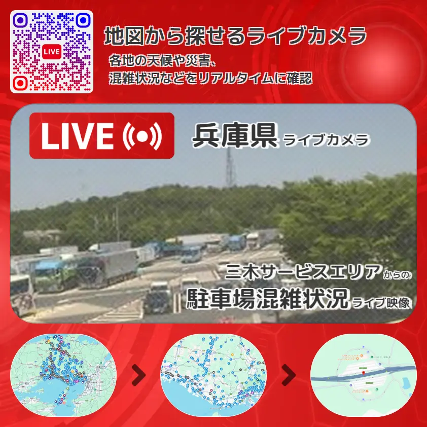駐車場混雑状況の他に、三木サービスエリア(三木SA)下りや周辺の気象状況も併せてチェックすることが可能で、台風・大雨・地震などの災害による被害状況も把握することができます。