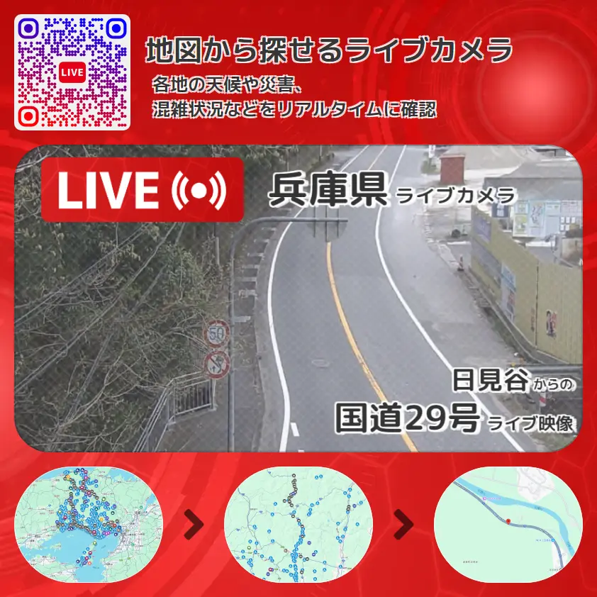 周辺の気象状況も併せてチェックすることが可能で、台風・大雨・地震などの災害による被害状況も把握することができます。