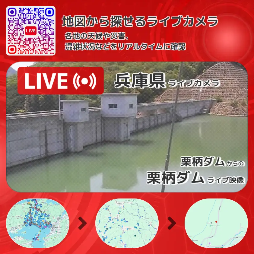 栗柄ダムの他に、滝の尻川や周辺の気象状況も併せてチェックすることが可能で、台風・大雨・地震などの災害による被害状況も把握することができます。
