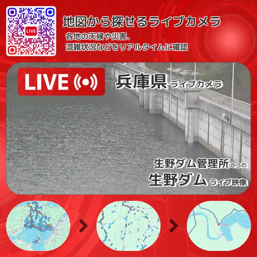 生野ダムの他に、銀山湖(ダム湖)や周辺の気象状況も併せてチェックすることが可能で、台風・大雨・地震などの災害による被害状況も把握することができます。