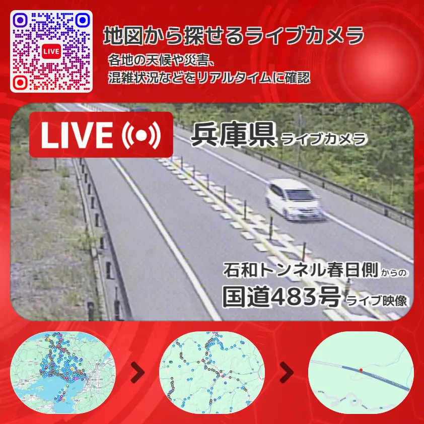 国道483号(北近畿豊岡自動車道和田山八鹿道路)の他に、北近畿豊岡自動車道(北近畿豊岡道・北近畿道)や周辺の気象状況も併せてチェックすることが可能で、台風・大雨・地震などの災害による被害状況も把握することができます。