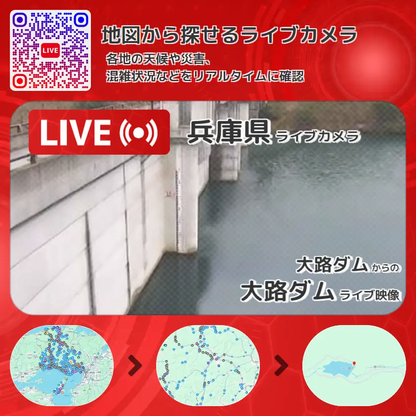 大路ダムの他に、大路川や周辺の気象状況も併せてチェックすることが可能で、台風・大雨・地震などの災害による被害状況も把握することができます。
