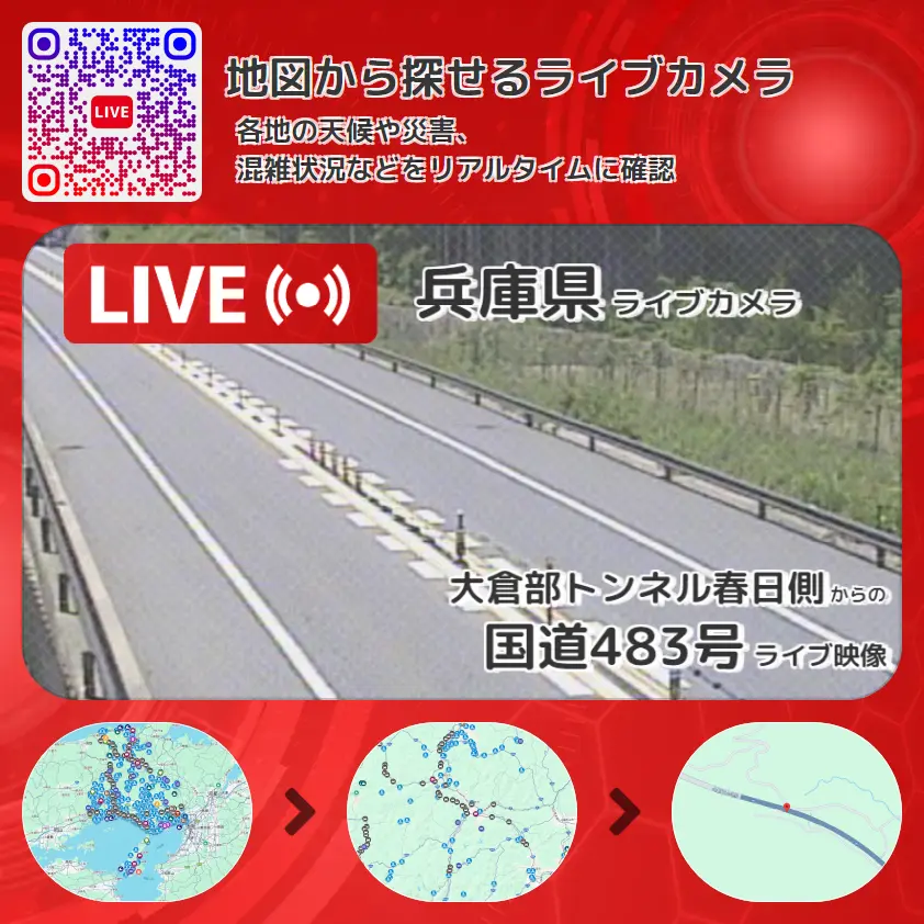 国道483号(北近畿豊岡自動車道和田山八鹿道路)の他に、北近畿豊岡自動車道(北近畿豊岡道・北近畿道)や周辺の気象状況も併せてチェックすることが可能で、台風・大雨・地震などの災害による被害状況も把握することができます。