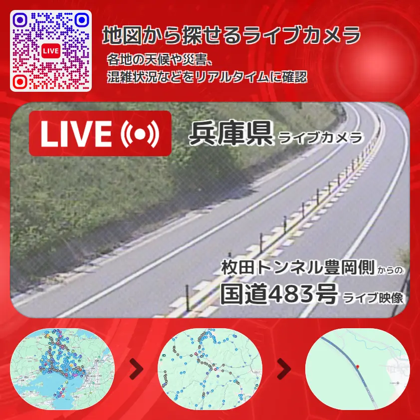 国道483号(北近畿豊岡自動車道和田山八鹿道路)の他に、北近畿豊岡自動車道(北近畿豊岡道・北近畿道)や周辺の気象状況も併せてチェックすることが可能で、台風・大雨・地震などの災害による被害状況も把握することができます。