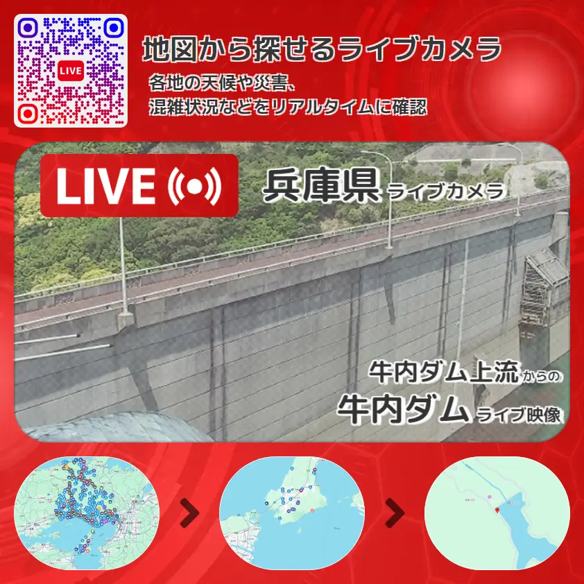 牛内ダムの他に、牛内川や周辺の気象状況も併せてチェックすることが可能で、台風・大雨・地震などの災害による被害状況も把握することができます。